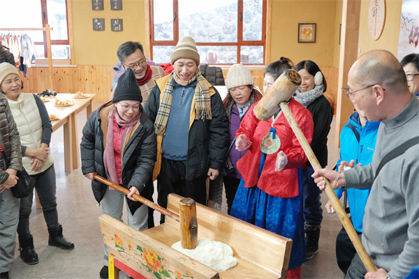 厚厚的積雪,純白的世界。在奶頭山村,能歌善舞的朝鮮族村民們以熱情奔放的舞蹈迎接遠道而來的客人。游客們挑選著一件件稱心如意的民族服飾,現場體驗制作辣白菜,品嘗千錘萬錘落木槽、軟糯可口的打糕……在冰雕玉琢的雪世界里,大家還充分感受了非遺文化的獨特魅力和奶頭山村村民特有的熱情。