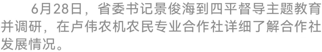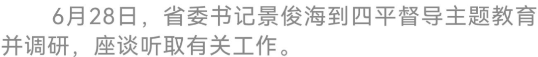 在即將迎來習近平總書記視察吉林三周年之際,省委書記景俊海今天(6月28日)到四平督導主題教育并調研,推動習近平總書記重要講話重要指示精神在四平落地生根、開花結果。他強調,要始終牢記習近平總書記殷殷囑托,保持團結奮斗、真抓實干的勁頭,突出抓好穩糧興農、援企興產、營商興業、拓基興市、惠民興政、保穩興治,奮力開創四平高質量發展新局面。
