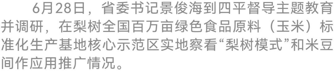 調研中,景俊海主持召開匯報會,聽取四平市有關工作并給予充分肯定。他強調,四平市要堅定不移深入貫徹習近平總書記視察吉林、視察四平重要講話重要指示精神,大力實施“一主六雙”高質量發展戰略,全力打造國家現代農業先導區、吉林省三產融合發展示范區和向南開放橋頭堡。一要堅定不移推動經濟高質量發展,聚焦轉型數字化、服務智能化、社會共享化、產業高級化,下大氣力狠抓招商引資,謀劃、引進、儲備一批重大項目,持續釋放消費潛能,在做大總量、做強規模、做優效益上持續用力。二要堅定不移推進農業農村現代化,持續增強糧食綜合生產能力,促進農村一二三產業融合發展,加快建設美麗鄉村,構建新型鄉村治理體系,深化農村綜合改革,全面推動鄉村振興。三要堅定不移推進高水平對外開放,持續深化長平一體化協同發展,加強與沈陽都市圈對接,拓寬與浙江金華對口合作領域,鼓勵支持企業和產品走出去,深度融入國內國際雙循環。四要堅定不移為群眾辦實事解難題,統籌抓好教育、醫療、養老、住房等社會事業發展,著力強化脫貧人口和困難群體兜底保障,多措并舉擴大就業,加強重點行業領域安全監管,牢牢守住安全發展底線。五要堅定不移營造良好政治生態,把開展主題教育與開展習近平總書記視察吉林三周年系列活動統籌起來,引導黨員干部追尋領袖足跡、傳承紅色基因、感恩知重奮進,大力弘揚“嚴新細實”優良作風,把堅決擁護“兩個確立”、堅決做到“兩個維護”體現到行動上,努力營造干事創業濃厚氛圍。四平市委要堅決扛起主體責任,推進全面從嚴治黨向縱深發展,切實守護好政治生態的“綠水青山”。