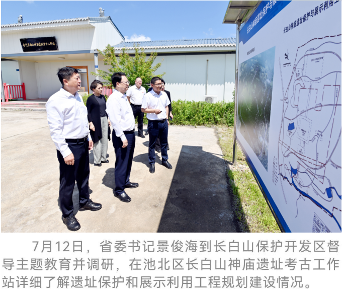 7月12日,省委書記景俊海到長白山保護開發(fā)區(qū)督導(dǎo)主題教育并調(diào)研。他強調(diào),要忠實踐行習(xí)近平生態(tài)文明思想,堅持保護生態(tài)和發(fā)展生態(tài)旅游相得益彰,完整把握、準(zhǔn)確理解、全面落實新發(fā)展理念,努力把綠水青山、冰天雪地變?yōu)榻鹕姐y山,為建設(shè)生態(tài)強省、加快振興發(fā)展作出新的更大貢獻。