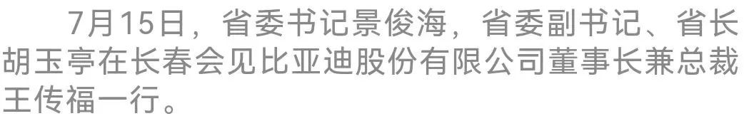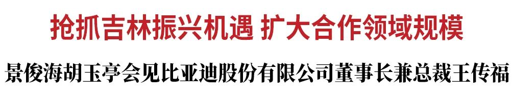 今天(7月15日),省委書記景俊海,省委副書記、省長胡玉亭在長春會見比亞迪股份有限公司董事長兼總裁王傳福一行。