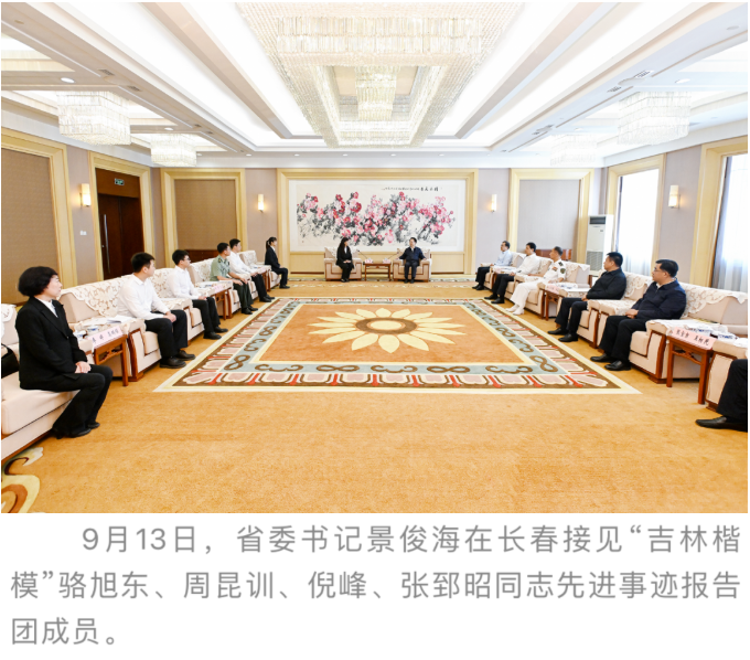 9月13日,省委書記景俊海在長(zhǎng)春接見“吉林楷模”駱旭東、周昆訓(xùn)、倪峰、張郅昭同志先進(jìn)事跡報(bào)告團(tuán)成員。