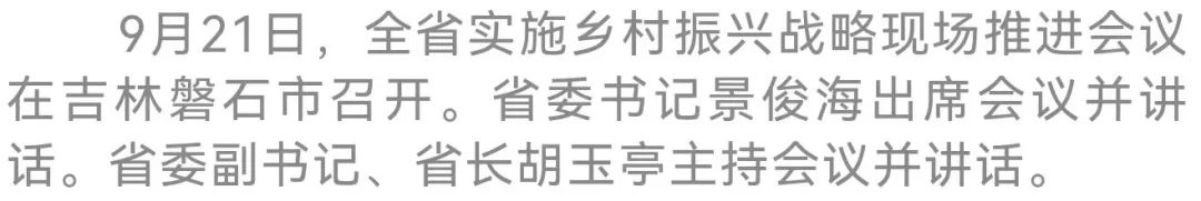 今天(9月21日),全省實施鄉村振興戰略現場推進會議在吉林磐石市召開。省委書記景俊海出席會議并講話。他強調,要深入貫徹習近平總書記關于“三農”工作的重要論述,全面對標對表習近平總書記在新時代推動東北全面振興座談會上的重要講話精神,借鑒推廣“千萬工程”經驗,著力發展現代化大農業,全面推進鄉村振興,努力建設彰顯吉林特色的宜居宜業和美鄉村。省委副書記、省長胡玉亭主持會議并講話。