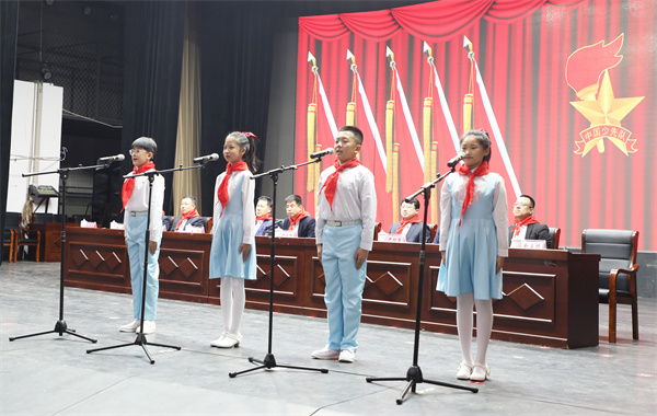 上午9時,大會在激昂的鼓號聲中拉開帷幕。少先隊旗手們高舉隊旗,在全體代表的肅立注目下,闊步前行。隊員們出隊旗、敬隊禮,全體與會人員起立奏唱國歌。隨后,少先隊員代表向大會獻詞。