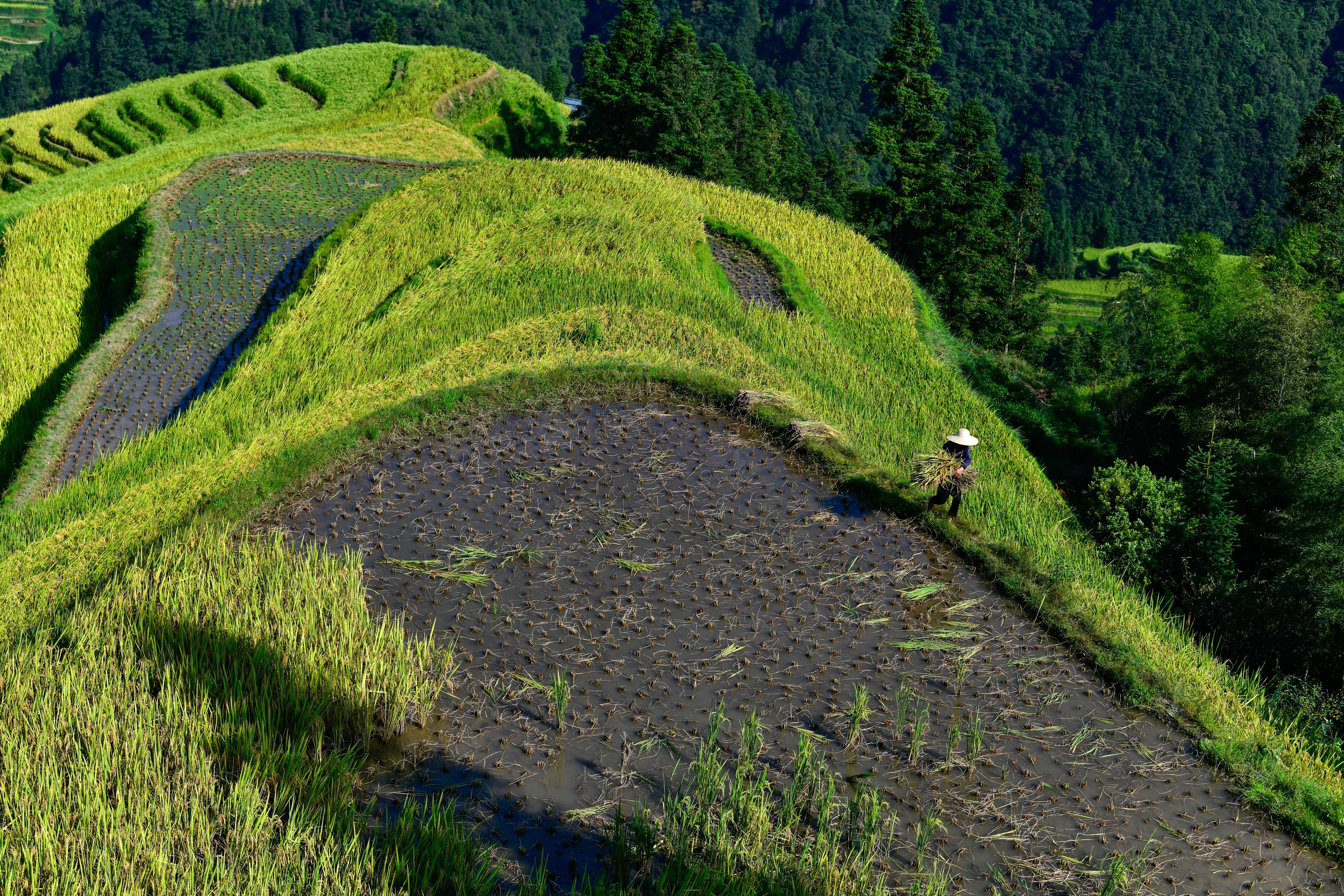 近日,位于月亮山區的貴州省從江、榕江等縣梯田種植的水稻陸續迎來收獲季節,當地農民抓住晴好天氣收割、搬運、晾曬稻谷,確保秋糧及時歸倉。