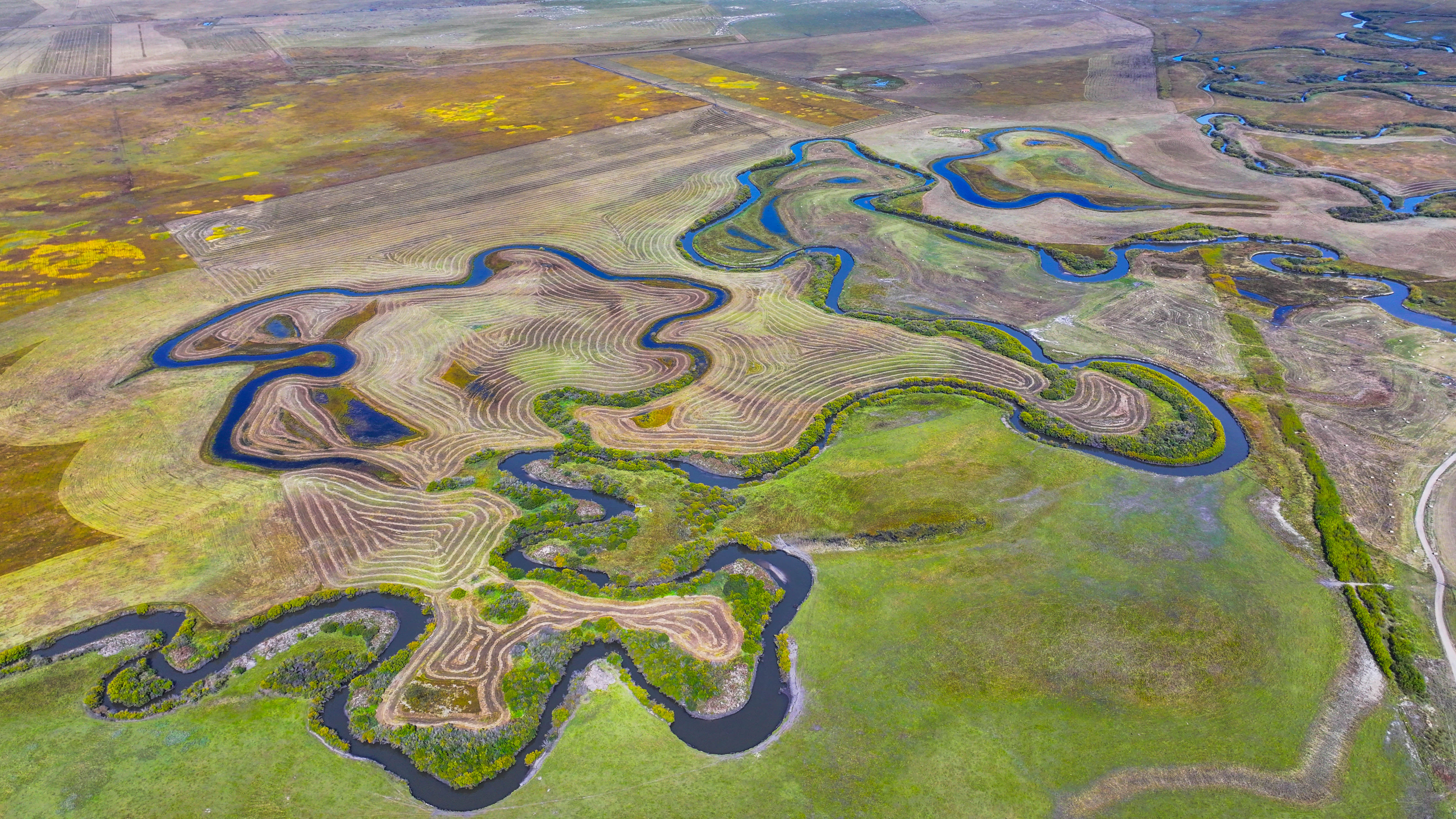 秋日,位于內蒙古錫林郭勒盟東北部的烏拉蓋草原色彩斑斕,蔚藍色的天幕下,河水蜿蜒流淌,草原披上“秋裝”。