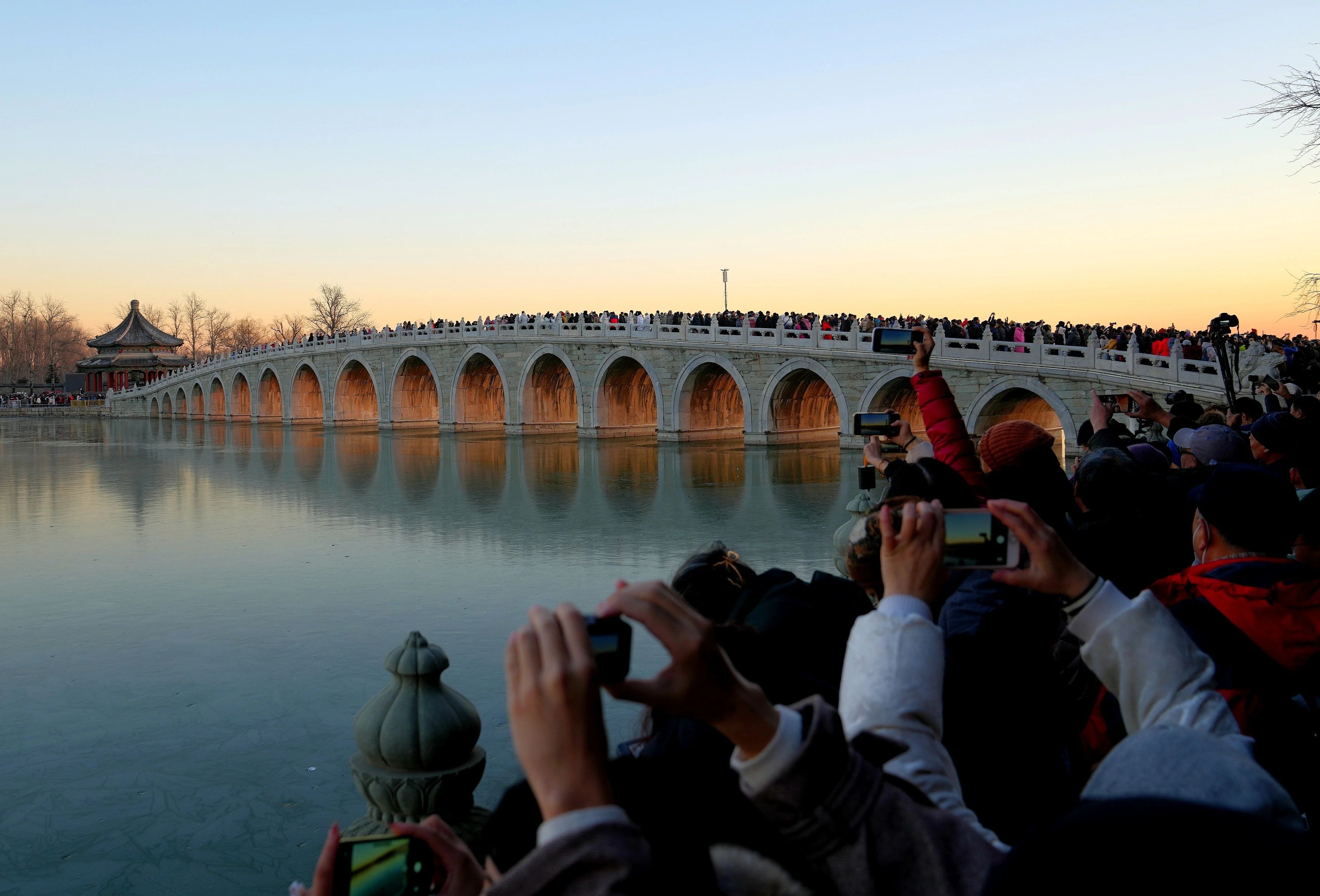 每逢冬至前后,北京頤和園十七孔橋便會上演“金光穿洞”的自然奇觀。