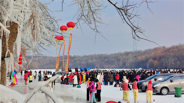 在舞臺北側(cè)冬捕區(qū)現(xiàn)場起網(wǎng)打魚,游客紛紛購買,希望“年年有余”。當(dāng)日的頭魚上臺進行競拍,45.5斤頭魚拍價8888元,將這次冰雪文化節(jié)氣氛推向高潮。在演出舞臺東側(cè)還搭建了冰滑梯、滑冰場,景區(qū)出租冰車、冰爬犁等冰上娛樂設(shè)備,千名游客盡情在冰面上玩耍。