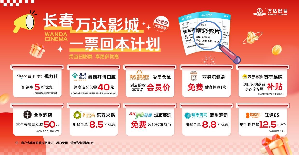 更有一個(gè)好消息值得影迷朋友們奔走相告。這個(gè)活動(dòng)可不多見(jiàn)!持萬(wàn)達(dá)影城票根可享受一票回本優(yōu)惠!吉林省內(nèi)21家萬(wàn)達(dá)影城與155個(gè)商家合作,其中65家餐飲店,就不一一細(xì)說(shuō)了,雪衣豆沙、鍋包肉、小雞燉蘑菇、鐵鍋?大鵝……你想吃的應(yīng)有盡有;35家生活?yuàn)蕵?lè)商家,健身、保健、游戲、采購(gòu)……你想干啥全都行!拿著春節(jié)期間喜氣洋洋的萬(wàn)達(dá)影城票根,至所在商場(chǎng)內(nèi)的指定商戶,吃喝玩樂(lè)享受超值優(yōu)惠權(quán)益!