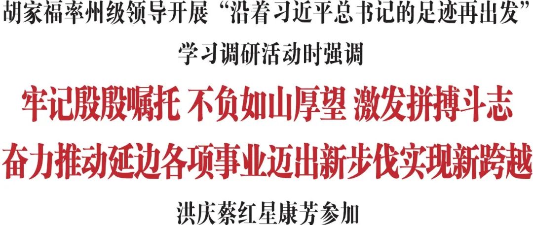在習近平總書記視察延邊十周年到來之際,7月15日,省委常委、州委書記胡家福率州級領導開展“沿著習近平總書記的足跡再出發”學習調研活動。他強調,要牢記殷殷囑托,不負如山厚望,激發拼搏斗志,堅定不移沿著習近平總書記指引的方向砥礪前行,奮力推動延邊各項事業邁出新步伐、實現新跨越。