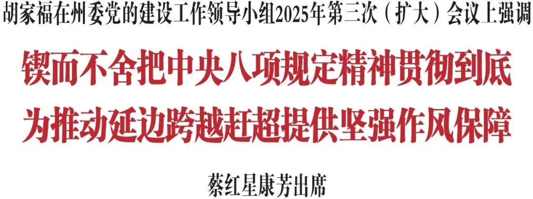 9月12日,省委常委、州委書記、州委黨的建設工作領導小組組長胡家福主持召開州委黨的建設工作領導小組2025年第三次(擴大)會議,傳達學習習近平總書記關于深入貫徹中央八項規定精神學習教育的重要指示和中央、省委黨的建設工作領導小組會議精神,總結我州學習教育工作,對鞏固拓展學習教育成果、推進作風建設常態化長效化進行研究部署。他強調,要深入學習貫徹習近平總書記關于黨的自我革命的重要思想、關于加強黨的作風建設的重要論述,按照中央和省委的部署要求,鍥而不舍把中央八項規定精神貫徹到底,為推動延邊跨越趕超提供堅強作風保障。州人大常委會主任蔡紅星、州政協主席康芳出席會議。