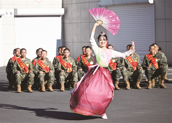 隨后,一場溫情又激昂的文藝演出點燃現(xiàn)場氛圍。混聲合唱《最美的歌兒獻(xiàn)給媽媽》傳遞家國情懷,男生獨唱《當(dāng)那一天來臨》盡顯軍人擔(dān)當(dāng),獨舞《道拉吉》展現(xiàn)民族風(fēng)采,表演唱《五好紅花寄回家》承載美好祝福。精彩節(jié)目輪番上演,為新兵們送上最真摯的鼓勁與祝福,現(xiàn)場掌聲與歡呼聲不斷。