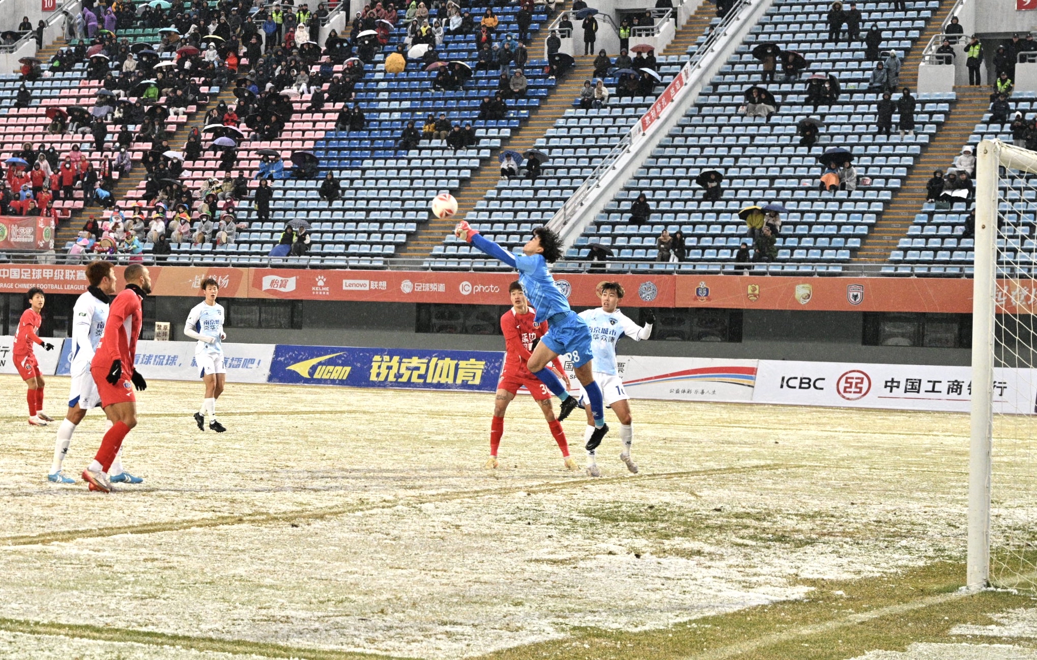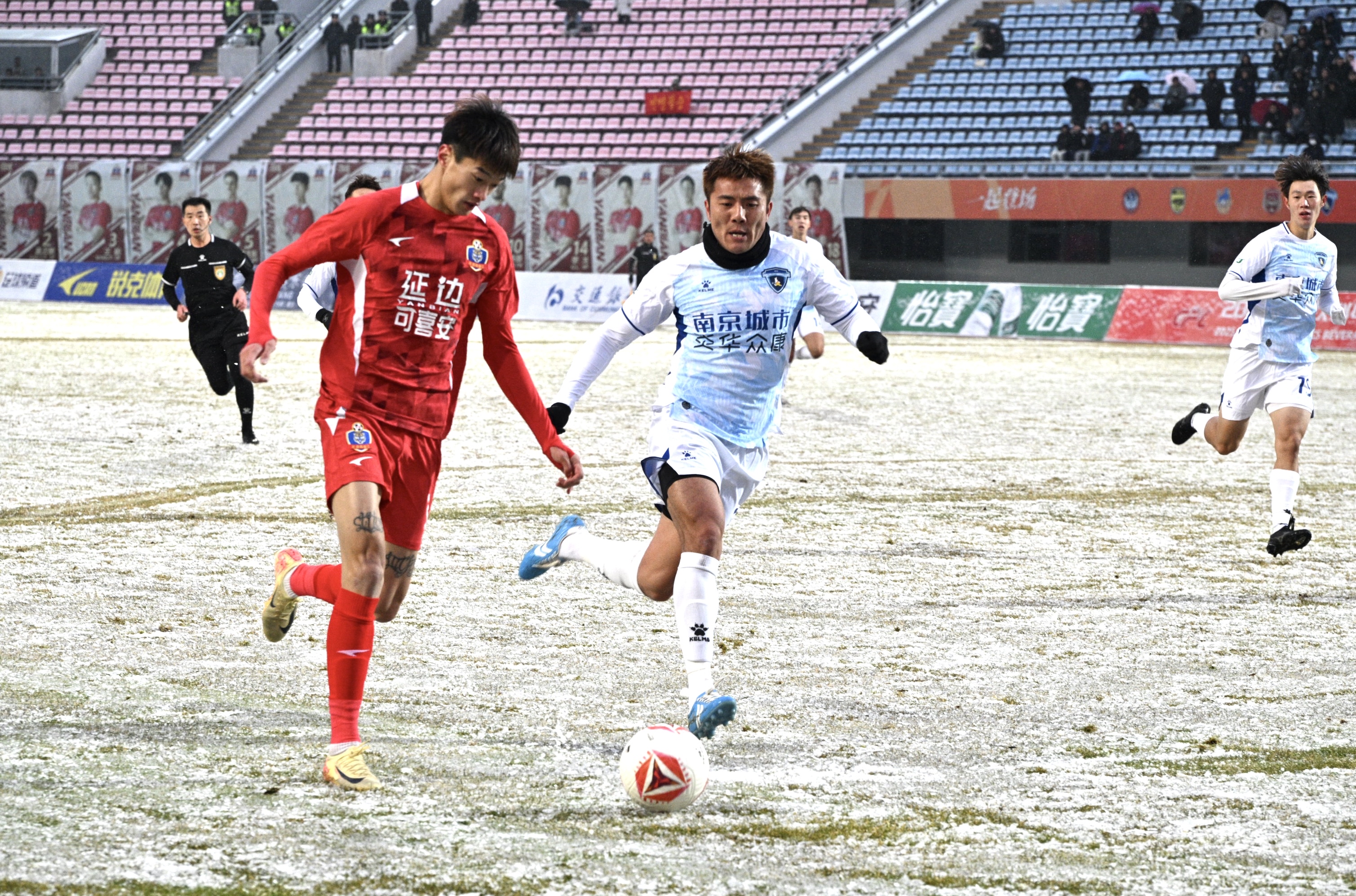 隨著主裁判的一聲哨響,比賽拉開帷幕。在一層薄冰的綠茵場上,雙方球員的爭奪顯得比較謹慎。第8分鐘,小將李潤豪的一腳挑傳,王子豪頭球破門。雖然裁判判定越位在先進球無效,但卻成為雙方加快進攻節奏的助推器。第13分鐘,福布斯在禁區內晃過防守球員勁射破門,延邊龍鼎可喜安隊1:0領先。隨后南京城市隊以密集的反擊,力圖改寫比分。第42分鐘,南京城市隊球員丁云峰因兩張黃牌染紅被罰下。上半場補時階段,南京城市隊球員杜君鵬妙傳,盧佩塔禁區內推射破門,將比分扳成1:1平。易邊再戰,由于南京城市隊場上少一名球員,力量明顯不足,延邊龍鼎可喜安隊的進攻效率顯著提升。黃振飛、徐繼祖、烏卡楚克烏分別破門,福布斯再進兩球完成帽子戲法,延邊龍鼎可喜安隊將比分鎖定為6:1。延邊龍鼎可喜安隊的每一次進球,都得到全場觀眾的熱烈歡呼。看臺上,呼喊聲此起彼伏,彩旗飛揚,鼓聲激越,觀眾腳下的積雪早已在人們縱情的擁抱和跳躍中融化。