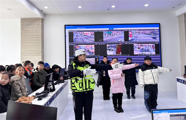 最受學生們歡迎的是交通指揮手勢學習環節。交警逐一演示停止、直行、左轉彎、右轉彎等常用指揮手勢,并耐心講解每個手勢的動作要領及適用場景。通過“教學+實操”的方式,學生們很快掌握了核心手勢。隨后,學生們來到城區重點路口路段,現場觀摩交警道路指揮執勤工作。寒風凜冽中,交警們筆挺的身姿和標準的手勢讓學生們深受觸動:“原來交警這么辛苦,以后我們一定要遵守交通規則,不給他們添麻煩!”