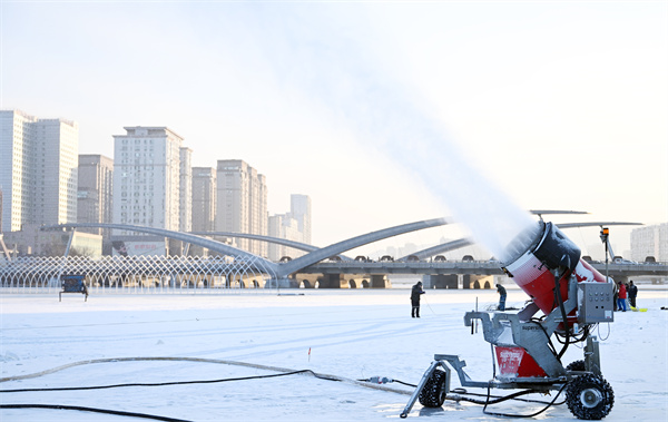 12月15日,記者在延吉市布爾哈通河延吉大橋西側的冰面上看到,工人們正在進行造雪作業,這也標志著2025—2026新雪季延吉冰雪歡樂谷的籌建工作已經啟動。