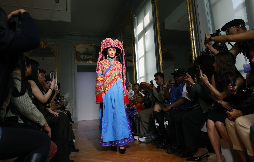 ↑2025年10月1日,在法國巴黎中國文化中心舉行的第三屆中法時裝周上,模特在“非遺四川·百城百藝”鹽邊·傈僳族服飾時尚秀上展示服裝。第三屆中法時裝周依托巴黎中國文化中心搭建的時尚秀場,為中法設(shè)計師與品牌提供了展示平臺。