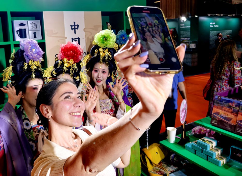 ↑2025年4月30日,一名參觀者與唐代仕女妝造的中方參展人員在法國巴黎博覽會上合影。以“中國風(fēng)·中國潮”為主題的“遇鑒中國”2025中華文化主題展4月30日亮相當(dāng)天開幕的法國巴黎博覽會。