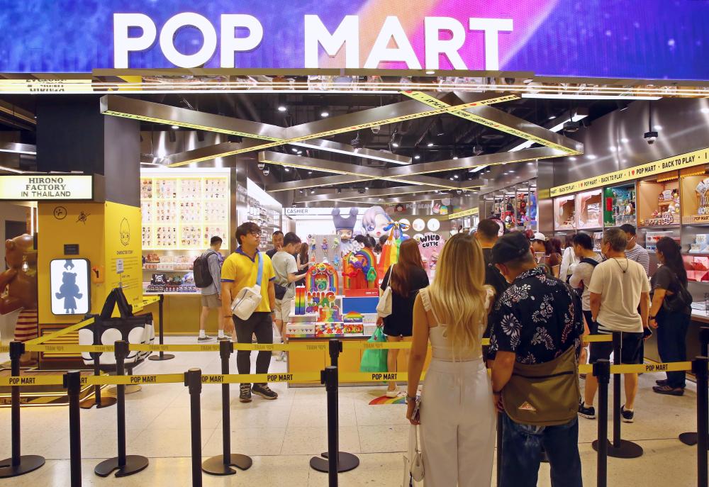 ↑2025年5月19日,在泰國曼谷尚泰世界購物中心,人們聚集在泡泡瑪特門店。泡泡瑪特推出的潮玩深受海外玩家喜愛。這些可愛玩偶的設(shè)計指向人們的“精神消費”和“情緒消費”需求,加之它們帶來的富有趣味性的體驗,使其迅速成為消費者追捧的對象。