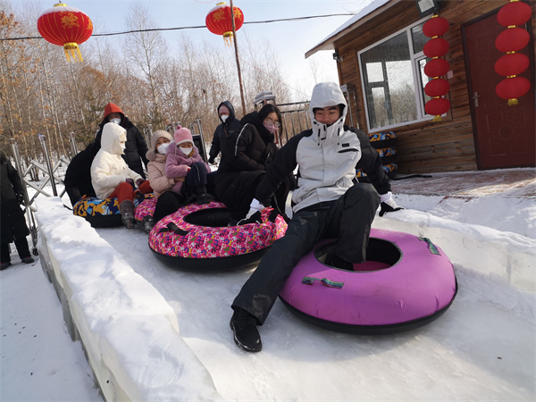在雪滑梯區,許多游客在玩雪圈。郭書暢小朋友和妹妹郭薈暢在父母的帶領下把四個雪圈連成一串,在工作人員的幫助下坐進雪圈,駛入滑道。在不斷的加速中,孩子們發出陣陣歡笑聲,讓人聽著都十分解壓。在冰場里,有人滑單腿驢,有人玩冰爬犁,有人抽冰尜。在雪坪里,有坐雪車的,有滑雪艇的,有玩碰碰車的,有打雪仗的,十分熱鬧。